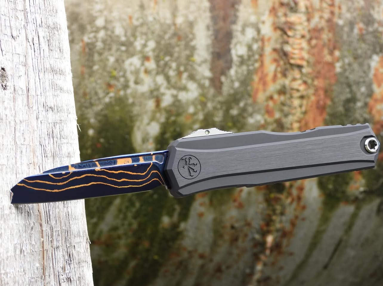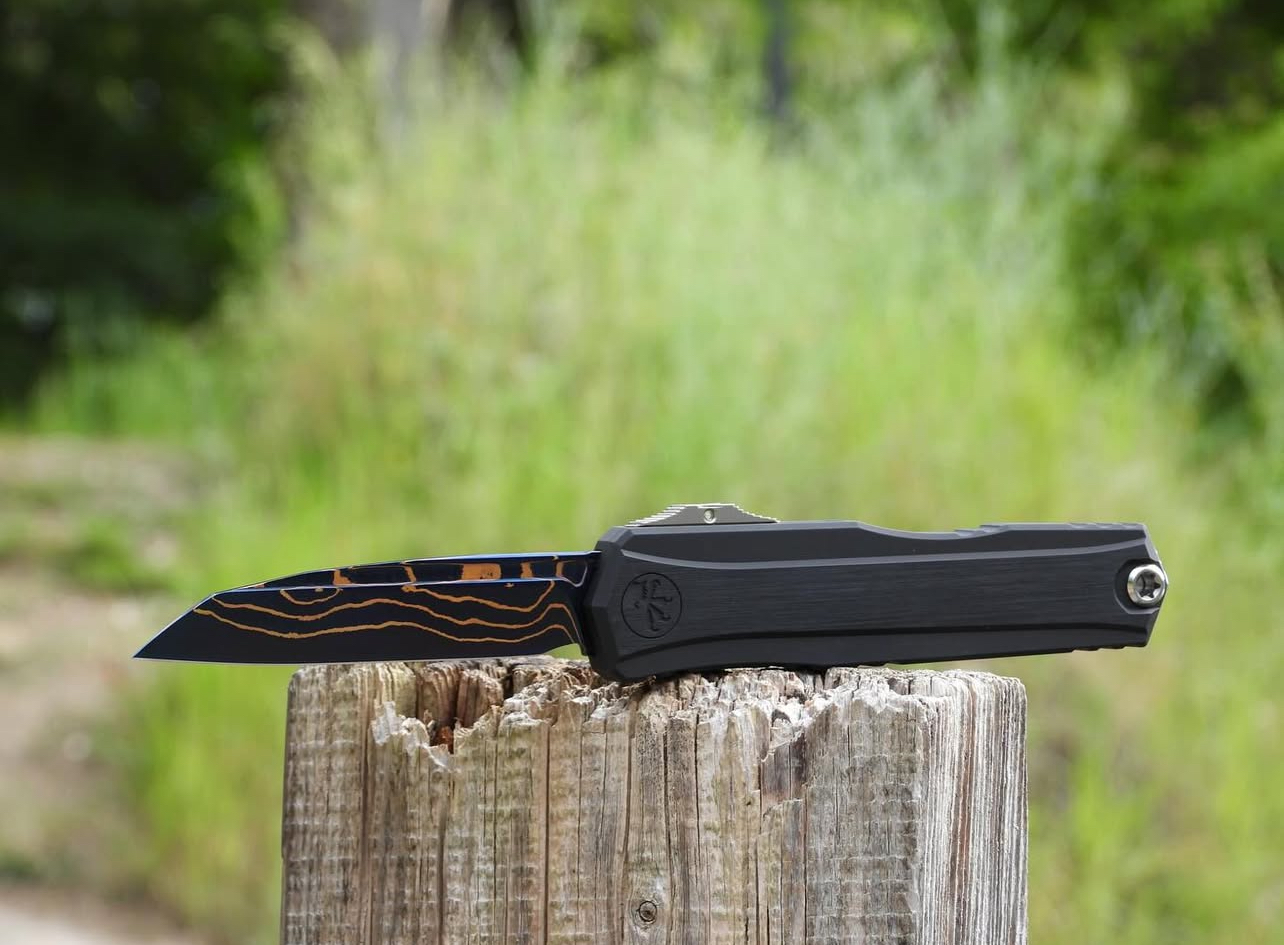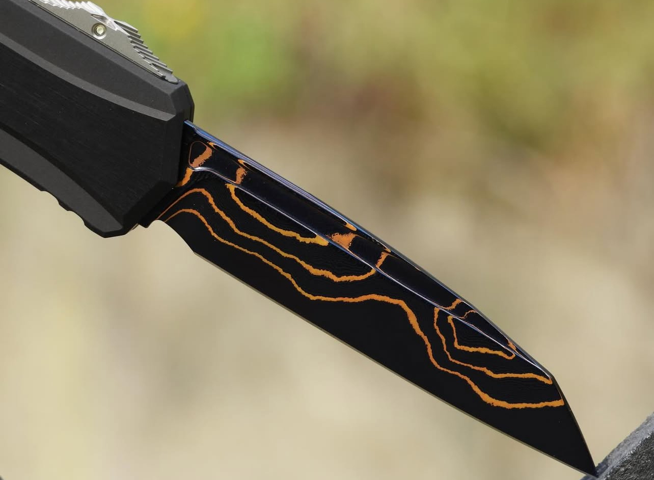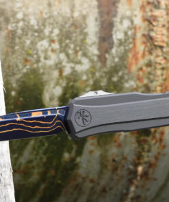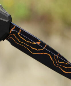 The Microtech/Marfione Cypher II OTF Automatic Knife with a 3.5” Wharncliffe blade in Blued Baker Forge Copper Mai Damascus is a premium out-the-front (OTF) automatic knife that combines advanced engineering with aesthetic elegance. Designed for collectors and enthusiasts, this knife offers both functionality and artistry.