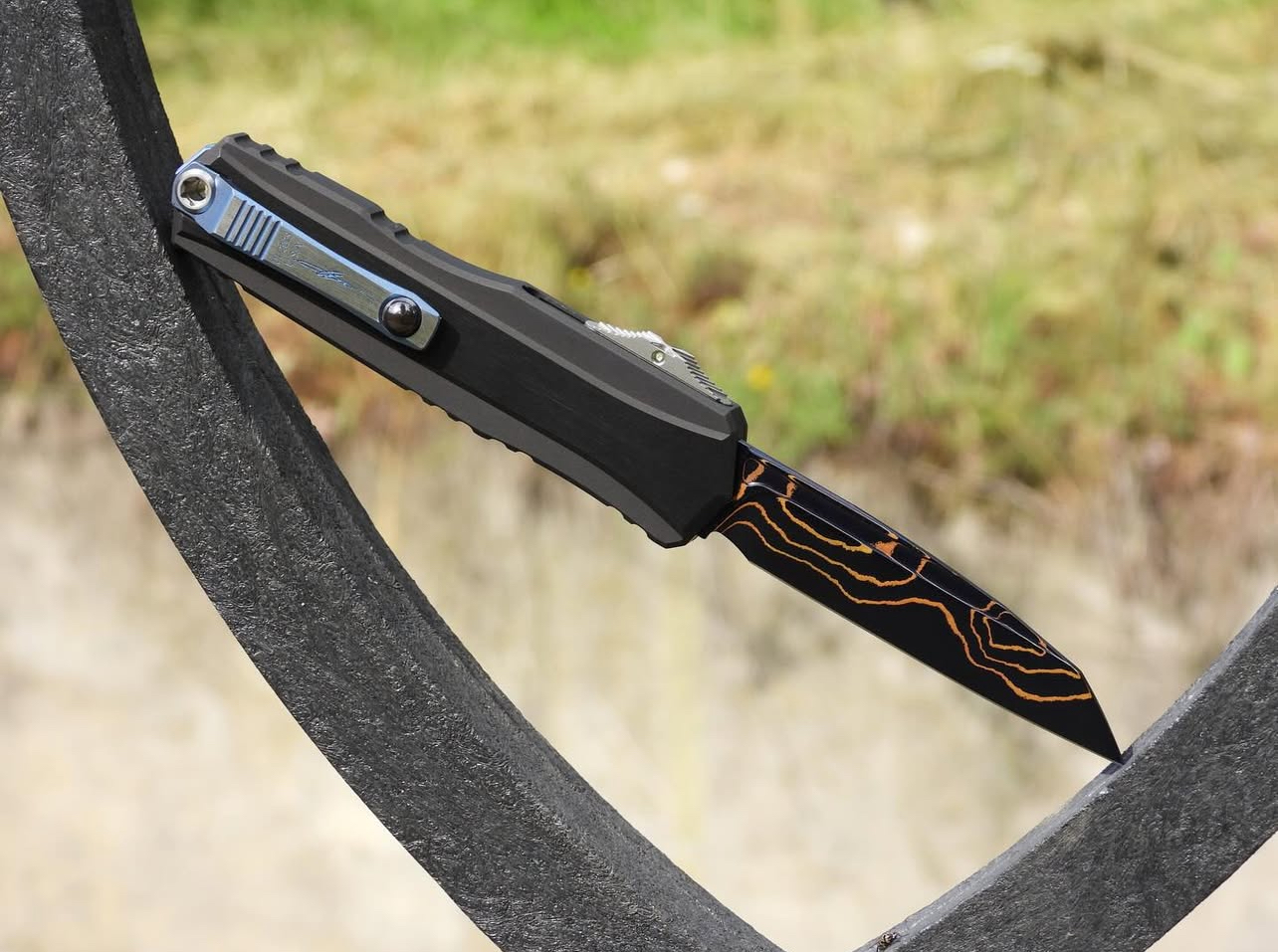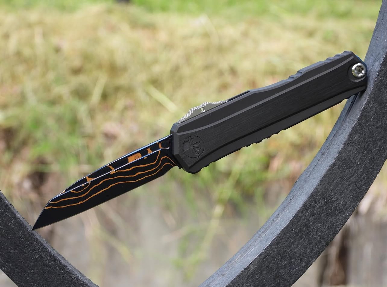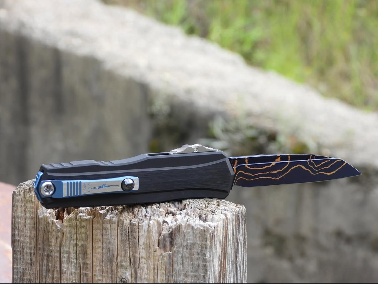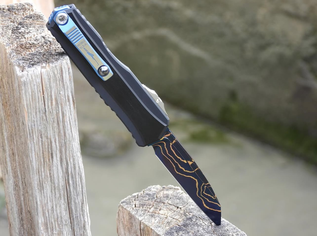 The Microtech/Marfione Cypher II OTF Automatic Knife with a 3.5” Wharncliffe blade in Blued Baker Forge Copper Mai Damascus is a premium out-the-front (OTF) automatic knife that combines advanced engineering with aesthetic elegance. Designed for collectors and enthusiasts, this knife offers both functionality and artistry.